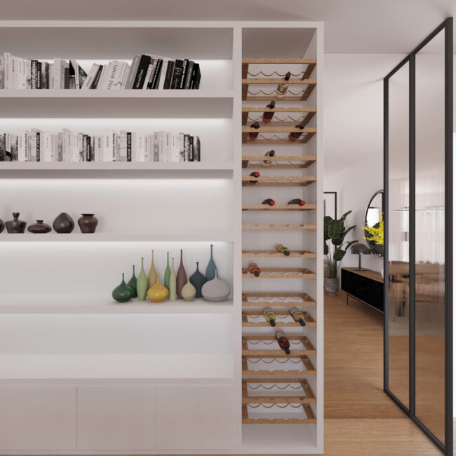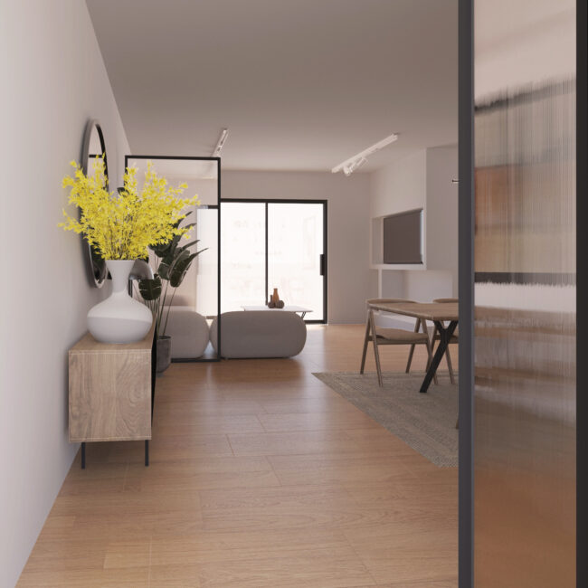 In an apartment, in Vrilissia, the living and the dining room is renovated. The purpose of the renovation was to give a fresh aspect to the apartment and organise the areas so as to take advantage of the entire space in the best possible way. In order for the whole area to get organised, semi- transparent glass panels are used as dividers. In front of the main living room window, a large mirror is placed, to intensify the natural lighting in the house. The custom made bookcase, the aesthetic of the furniture, the decoration and the lighting fixtures have transformed the space, in a way, that provides the contemporary living.