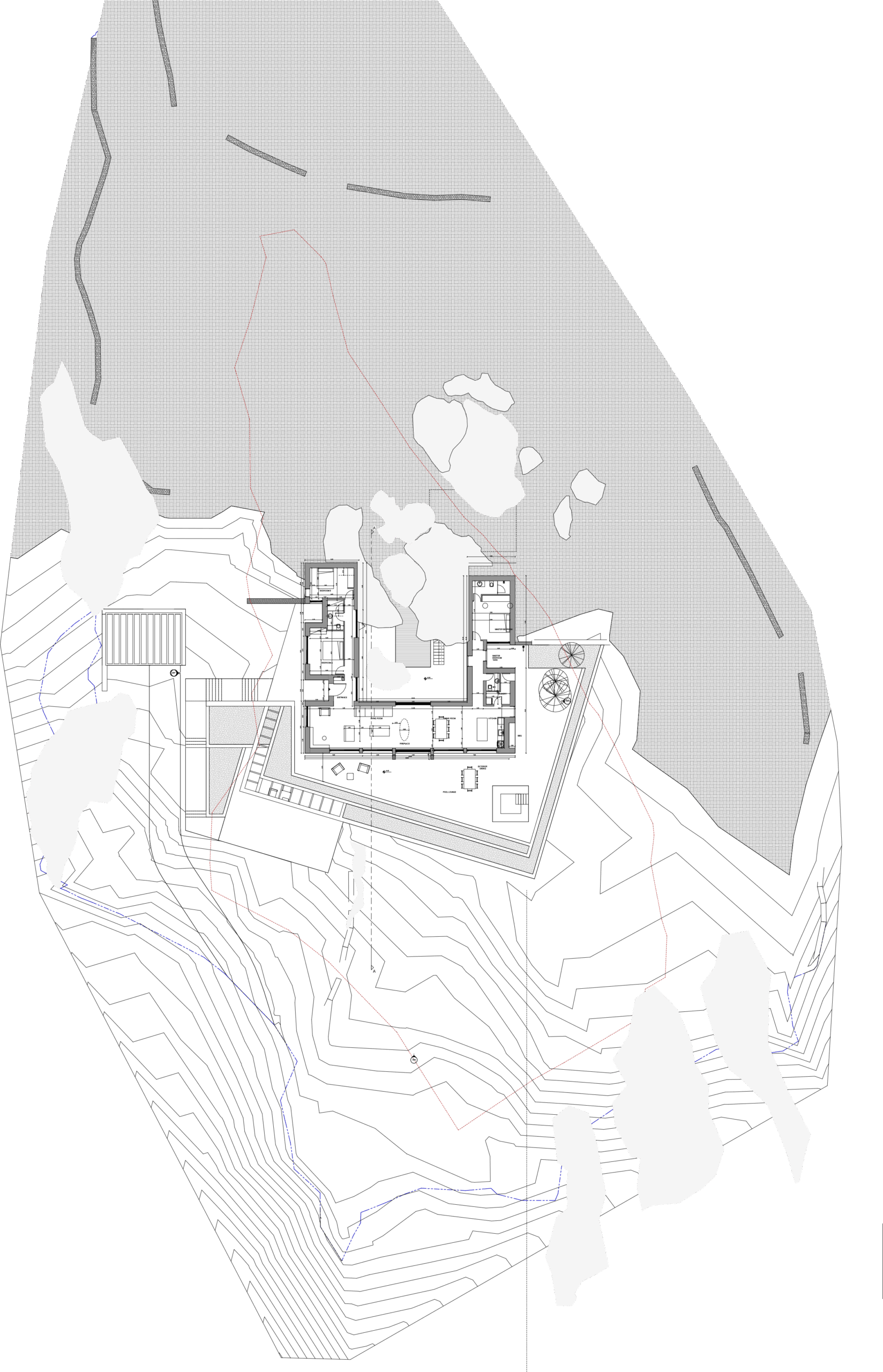 The composition unfolds around the natural formations of the site, with the building enclosing the rocks in a U-shaped gesture. This relationship — between geometry and nature — defines the project’s central concept.